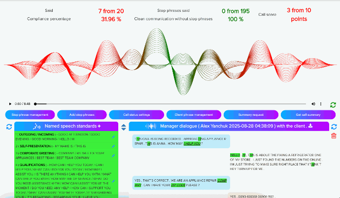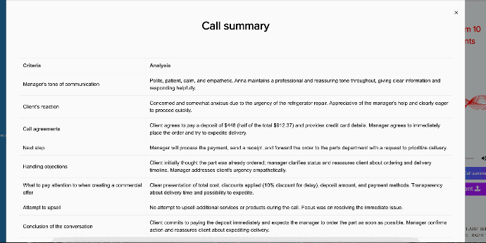 Now every conversation is under total control: AI guides the rep through the script, highlights completed stages in green and missed ones in red. It counts how many objections the client raised — and how many the rep actually handled. At the same time, it fills in the CRM card and assigns scores. As a result, the manager sees clearly: who brings in money, and who keeps leaking it.